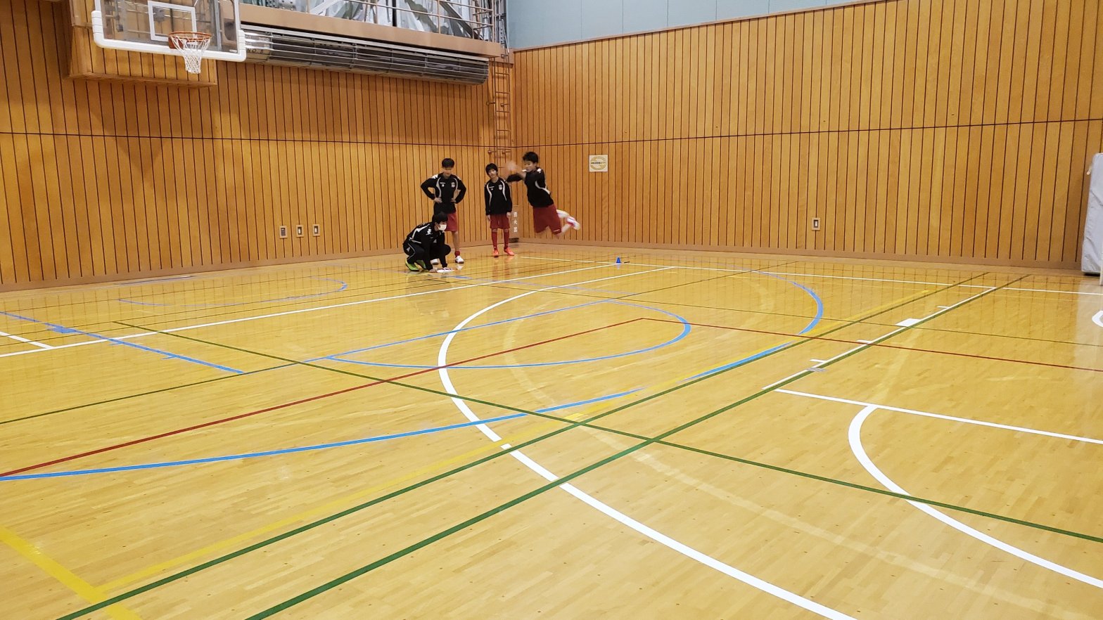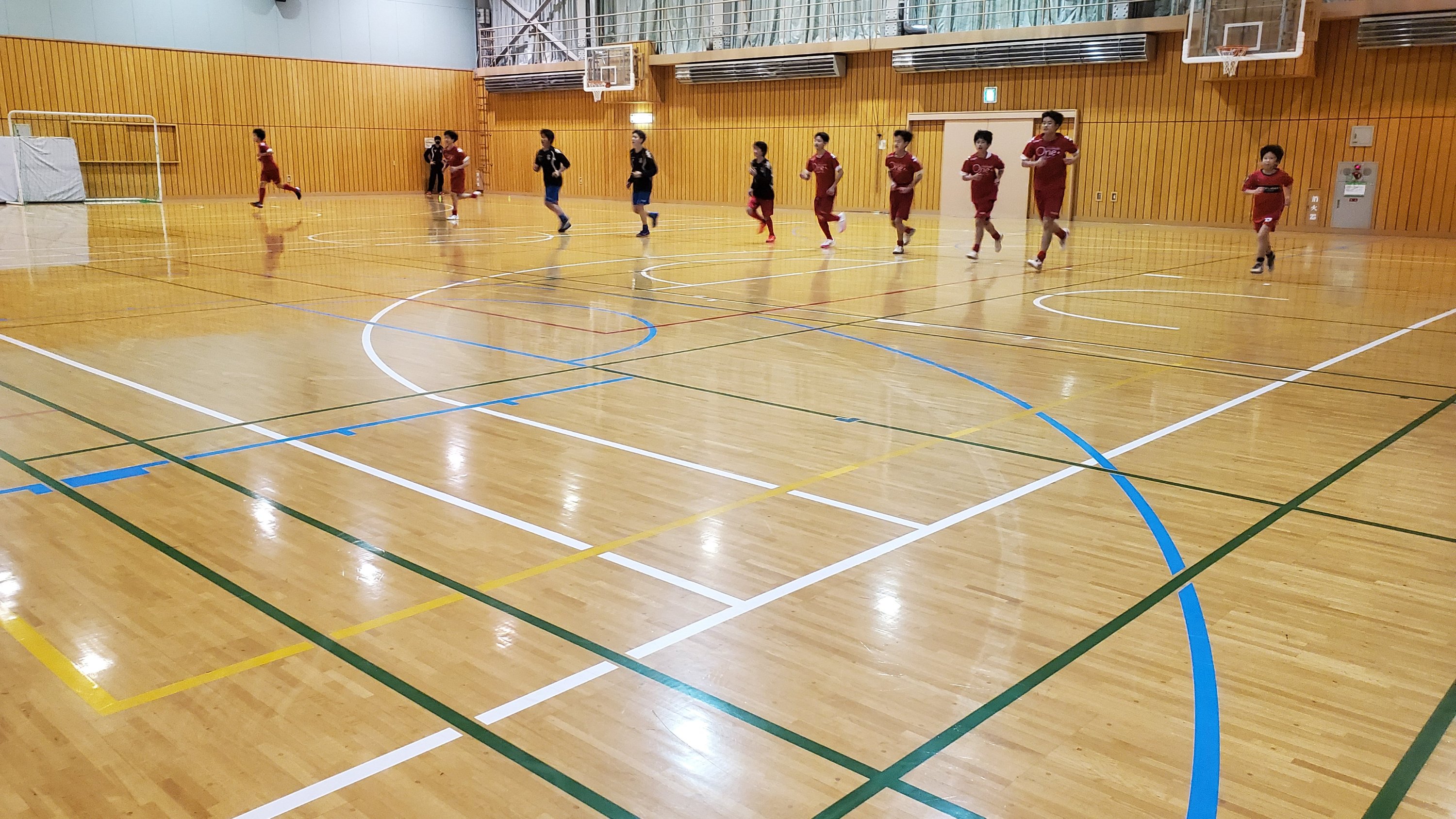 3グループに分かれ、ジャンプ系、ダッシュ、ステップ、シャトルランニングを実施。